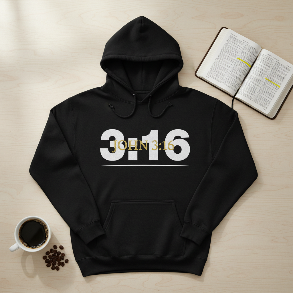 This stunning John 3:16 hoodie transforms the most powerful verse in Scripture into wearable art. The bold gold glitter design catches the light beautifully against premium black fabric, creating an eye-catching statement piece that sparks conversations and shares hope wherever you go.